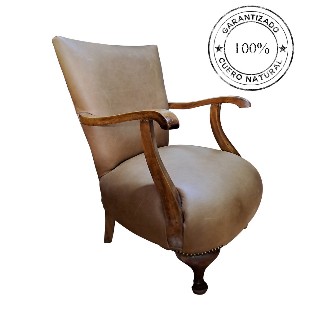 Poltrona fabricada con estructura de madera recuperada noble, tapizada en cuero de selección. Cómoda y elegante.